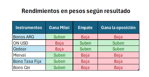 Vamos a analizar tres posibles resultados como interpretación del mercado: que gane Milei, un empate o que gane la oposición: