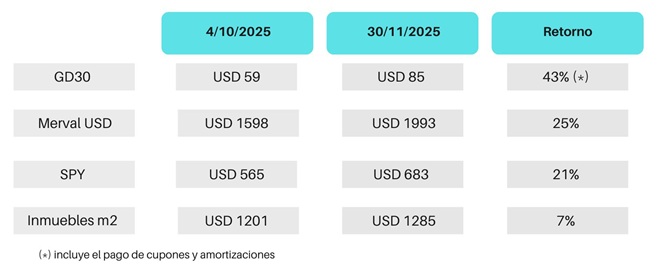 Analicemos los rendimientos de las distintas clases de activos desde octubre de 2024 a noviembre 2025: