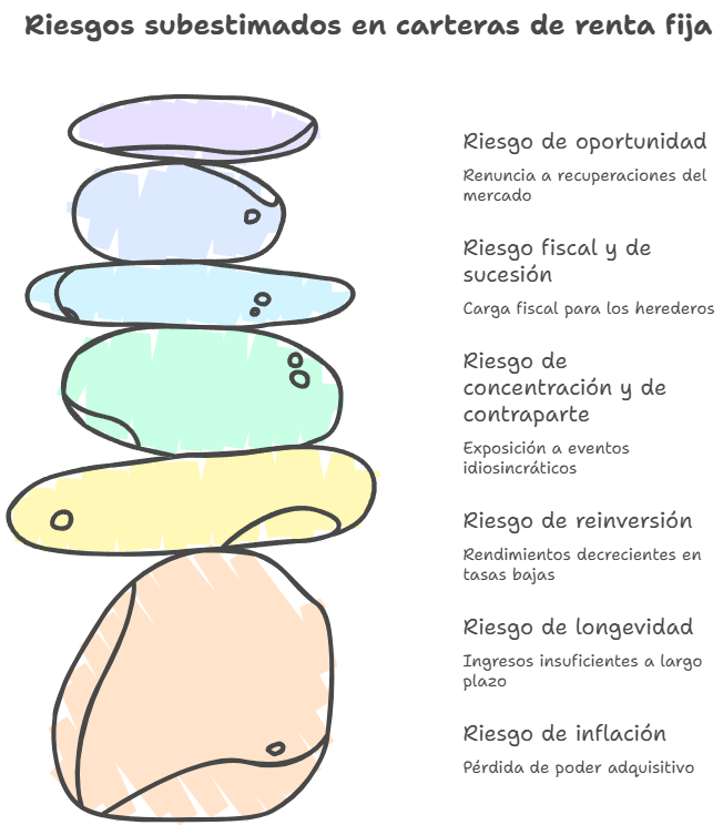 Un patrimonio grande que genera cupones fijos puede perder poder adquisitivo de forma silenciosa. Para alguien con gastos crecientes (salud, educación, estilo de vida), la inflación real es un enemigo que no se ve en el extracto mensual. - Riesgo de longevidad