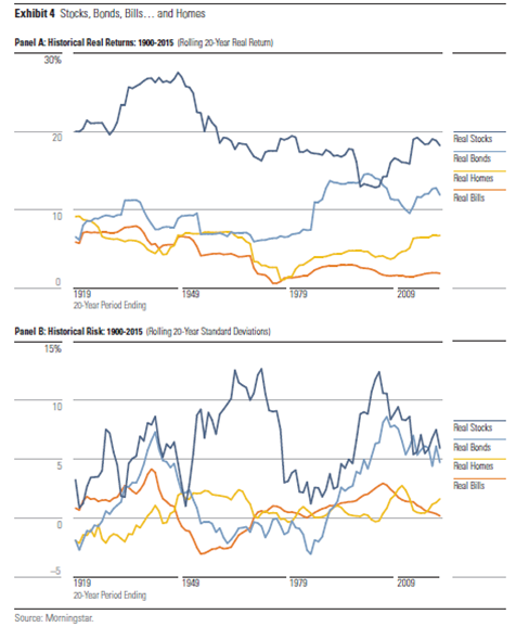Este gráfico de Morningstar proporciona una perspectiva fundamental sobre los retornos reales (es decir, ajustados por inflación) de las viviendas, comparados con acciones, bonos y letras del tesoro (TBills). El análisis abarca períodos móviles de 20 años desde 1900, utilizando datos de precios de viviendas del sitio web de Robert Shiller y datos de acciones, bonos y letras del conjunto de datos de Dimson, Marsh y Staunton (2012).